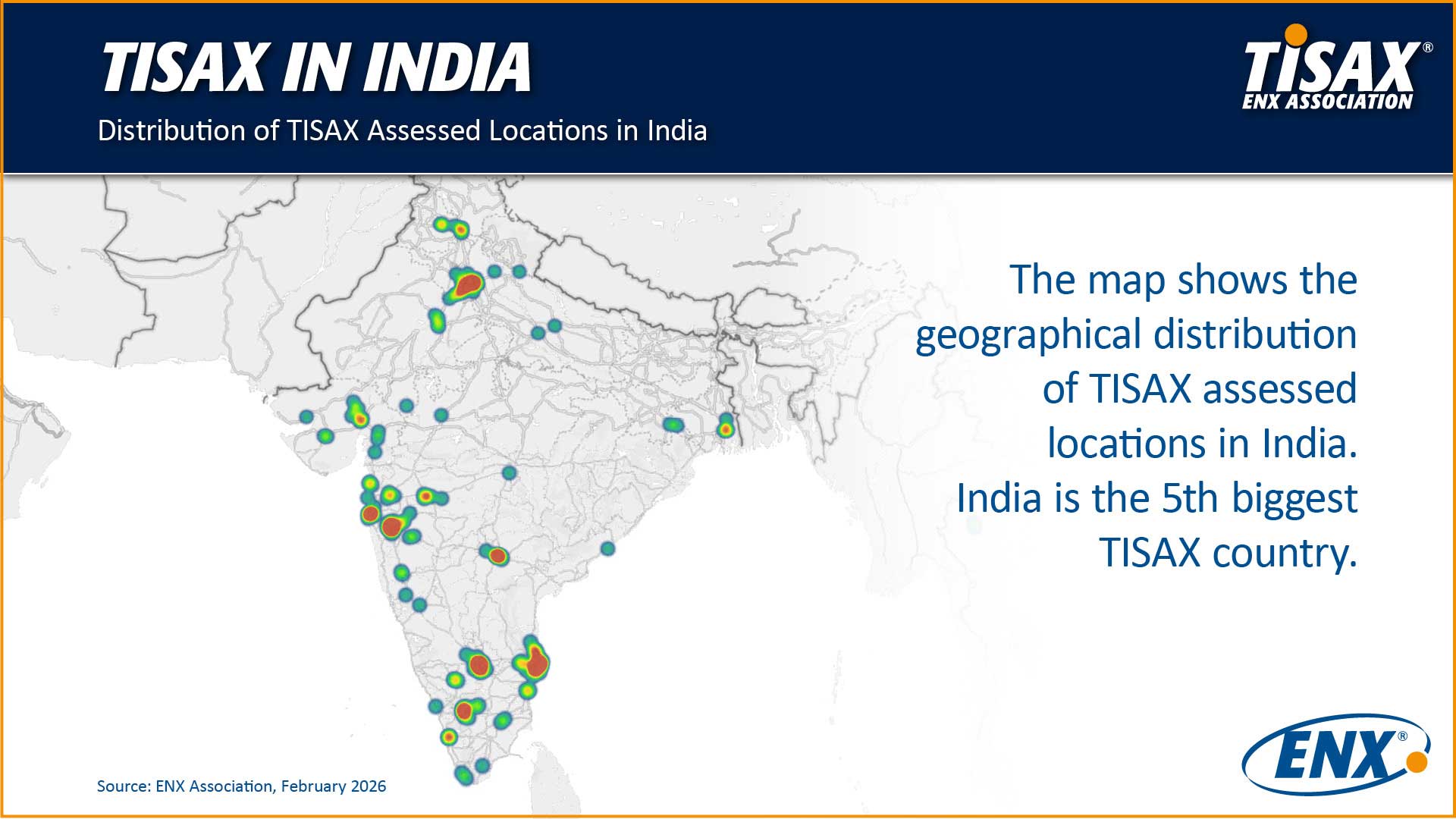 The India heatmap highlights the geographical distribution of TISAX‑assessed locations across the country and confirms that India is the fifth largest TISAX country worldwide.